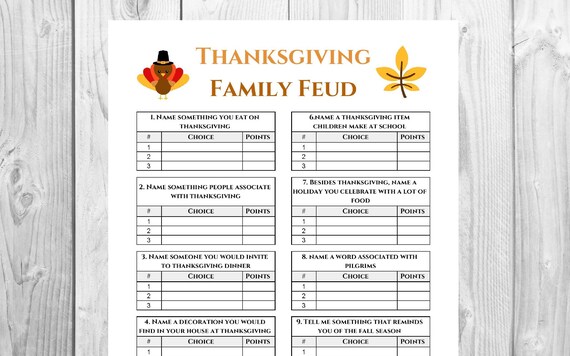 Name an activity you do on Thanksgiving other than eating. Questions are all centered around traditional Thanksgiving knowledge. WATCH FAMILY FEUD AND THEN ENTER TO WIN 700. Bestseller Add to Favorites Thanksgiving Bingo Children Thanksgiving Party Game 500 Unique Cards.